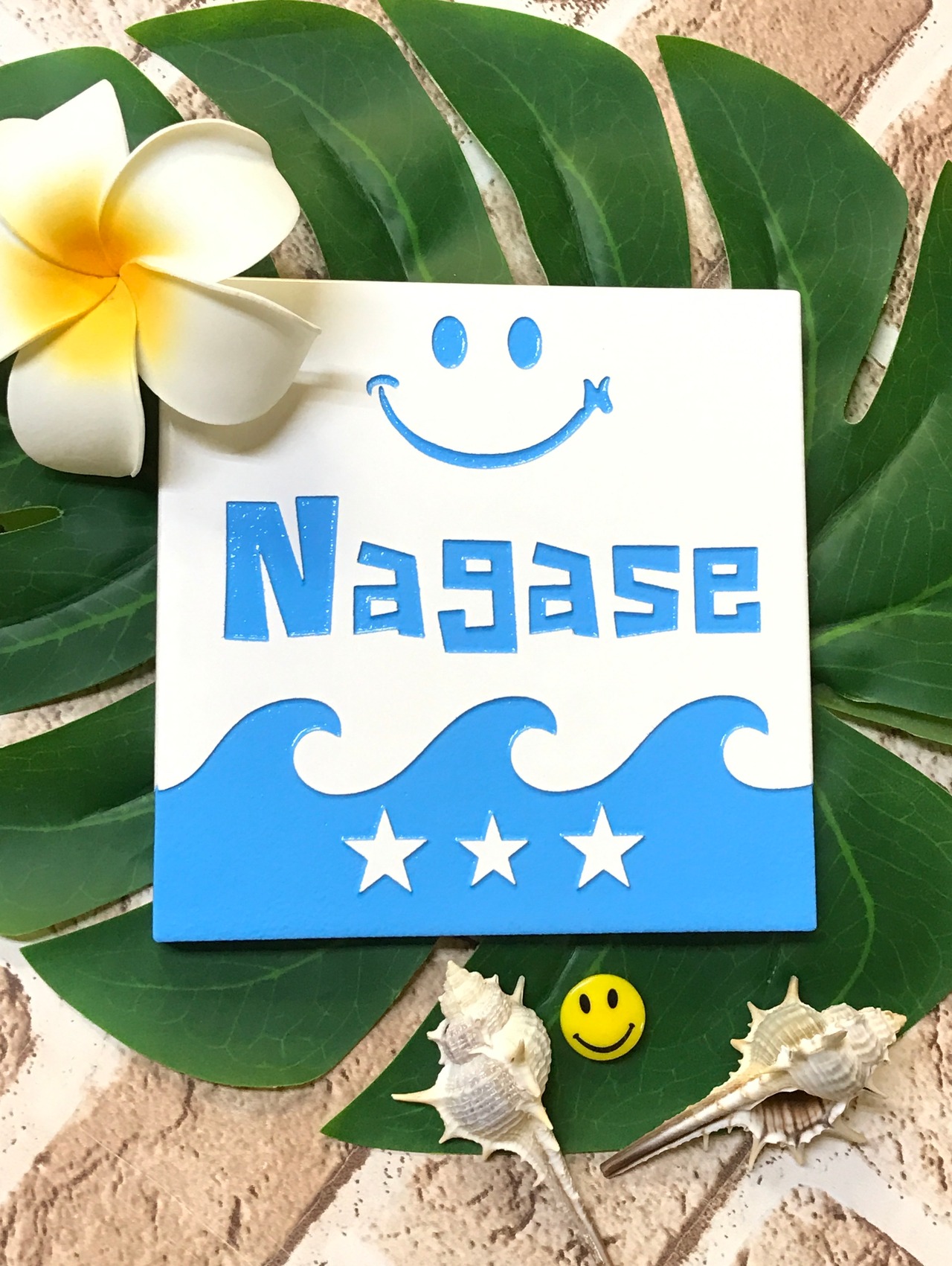 白タイルにNAMIを爽やかな水色で色付けし、可愛らしいニコちゃんとバーンスター☆で賑やかなタイル表札に仕上げてあります(*´罒`*)ニヒヒ♡